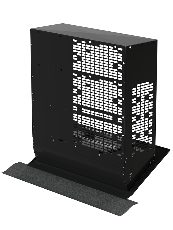 Die Haube ist an der Rückseite offen, um eine optimale Abluftführung zum Dach zu gewährleisten. Die Vorderseite der Haube kann ebenfalls entfernt werden, sodass die gesamte Haube nach hinten gekippt werden kann. Dadurch ist die Wärmepumpe von allen Seiten zugänglich.